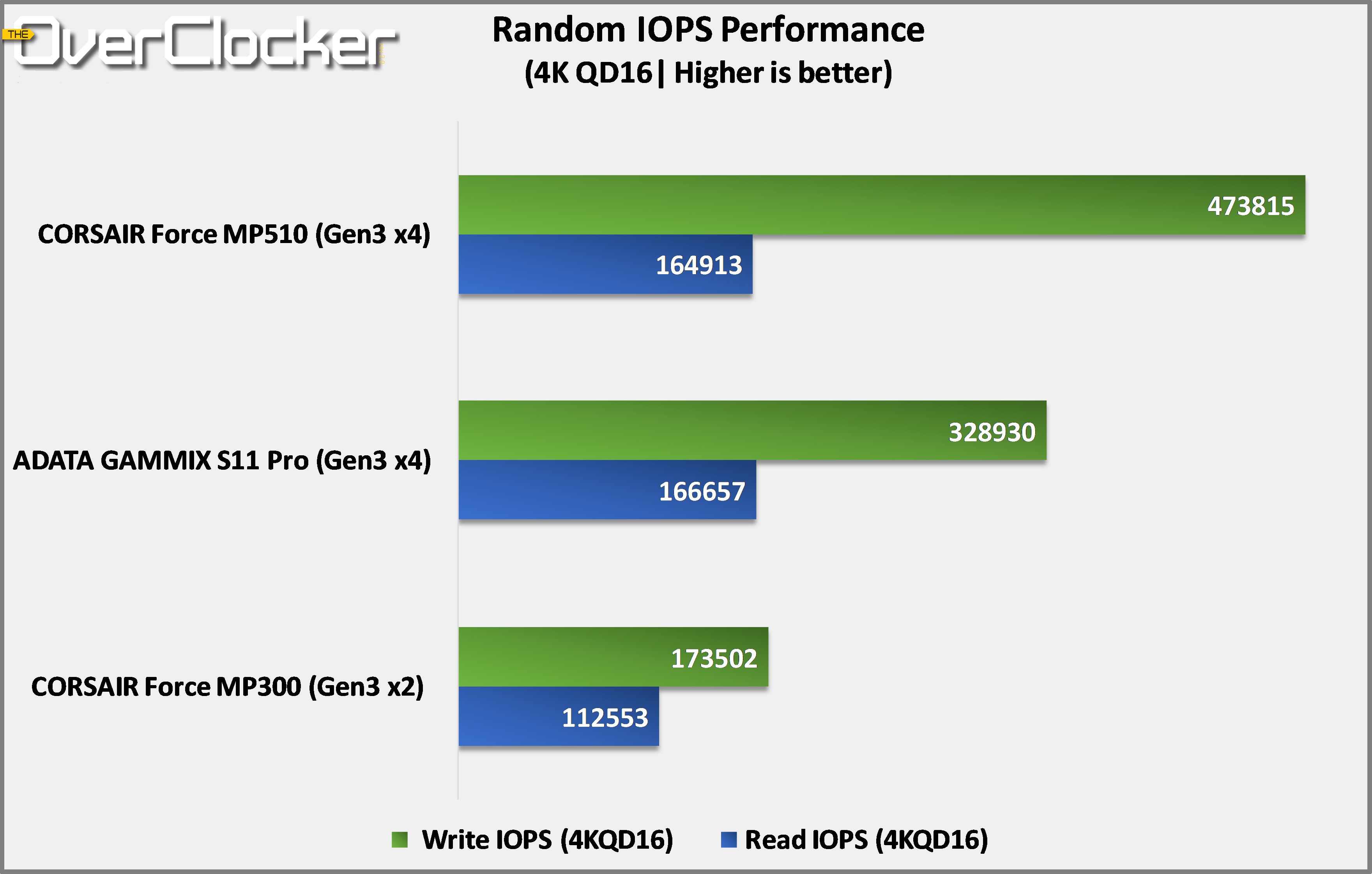 As expected, the IOPS performance is reflective of the speeds shown above, with the ADATA drive once again taking read performance victory over the Corsair MP510. Write performance is lower, but still not to be scoffed at. There are plenty of NVMe drives around that can’t come near these figures.