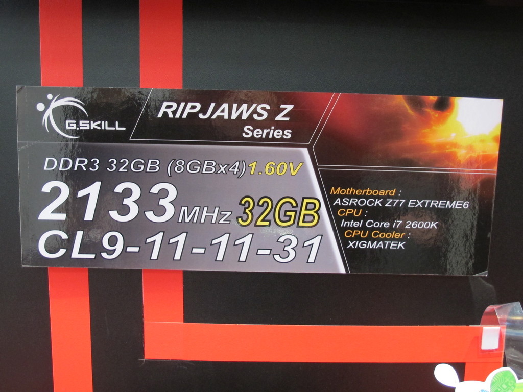 Working closely with leading motherboard manufacturers, G.Skill is ready to provide PC enthusiasts the best dual channel memory for the upcoming Z77 motherboards. On the MSI Z77A-GD65 and ASRock Z77 Extreme6 motherboards, G.Skill has demonstrated the 32 GB super size memory kits at DDR3 2133 MHz ultra high speed with Intel Core i7 2600K processors.