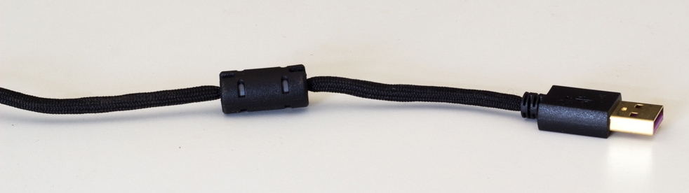 The 1.8m cable is one of the softest we’ve seen, feeling more like a shoelace than a cable. It is so soft, in fact, that even the low 53 grams of the mouse doesn’t get moved around by it. On the USB connector end is a ferrite core to reduce interference. The plastic inside the USB connector is purple, a touch we’ve grown accustomed to with Cooler Master.