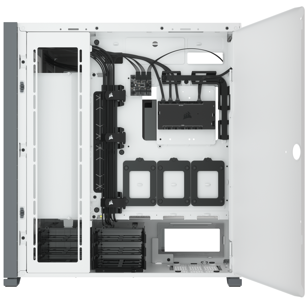 The 7000 Series’ tempered glass window showcases your premium components, while the case cleverly conceals your cables. The CORSAIR RapidRoute cable management system routes major cables through a single hidden channel, with a spacious 30mm of routing depth behind the motherboard and two tool-free hinged side panels for easy access. A three-slot vertical GPU mount on the PSU shroud puts any size graphics card center stage.
