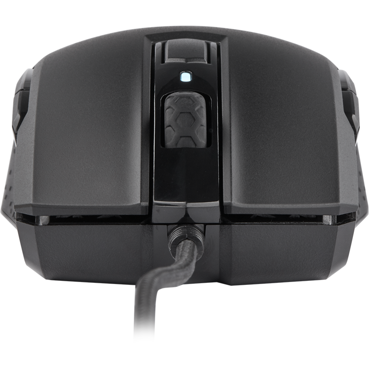 The primary buttons are integrated into the shell of the M55 RGB PRO, giving it a non-interrupted appearance. A heavily textured wheel sits in the usual place, and it has well defined steps. The middle click requires just the right amount of actuation force to not be clicked by accident while avoiding accidental scrolling when clicking.