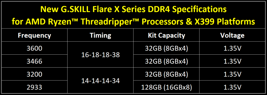 Taipei, Taiwan (10 Aug 2017) – G.SKILL International Enterprise Co., Ltd., the world’s leading manufacturer of extreme performance memory and gaming peripherals, announces all-new DDR4 specifications and expanding the Flare X series, designed for AMD processors and platforms. Compatible with the new Ryzen Threadripper processors and AMD X399 chipset motherboards, these new DDR4 specifications are designed to achieve high frequency at DDR4-3600MHz 32GB (8GBx4), as well as a massive total capacity at DDR4-2933MHz 128GB (16GBx8). Included in the mix of new quad-channel DDR4 memory kits are DDR4-3200MHz CL14 32GB (8GBx4) and DDR4-3466MHz CL16 32GB (8GBx4).