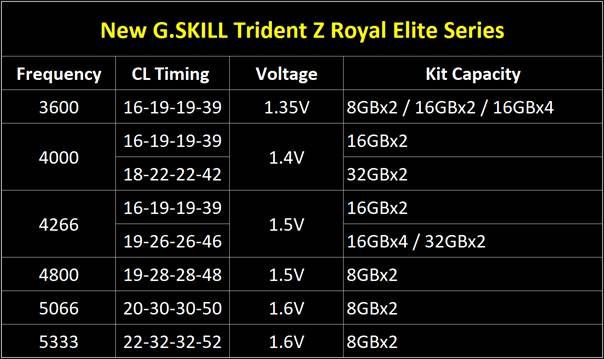 Continuing the ongoing G.SKILL legacy for fast DDR4 memory performance, the Royal Elite offers high-class memory specifications that range from DDR4-3600 to DDR4-5333 and offers 16GB (8GBx2) to 64GB (32GBx2) in kit capacity at launch. Each memory kit is constructed from hand-screened memory IC chips and tested for compatibility across a wide range of motherboards to ensure stability and high-frequency overclocked performance. For a list of specifications available at launch, please refer to the chart below: