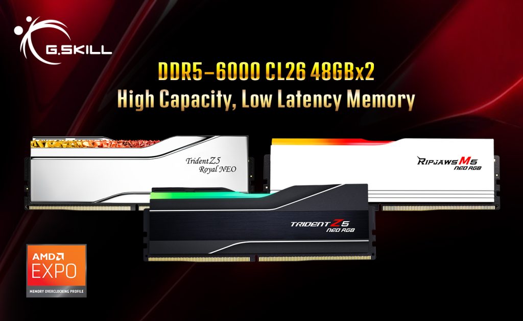 G.SKILL International Enterprise Co., Ltd., the world’s leading brand of performance overclock memory and PC components, is announcing a new high-capacity, low-latency DDR5 specification of DDR5-6000 CL26 with a total of 96GB (48GBx2) kit capacity, intended for the AMD AM5 platform. Designed for PC enthusiasts, gamers, professionals, and AI applications who are looking for high performance, this new memory kit enables low-latency performance at high kit capacities on the latest AMD computing platforms.
