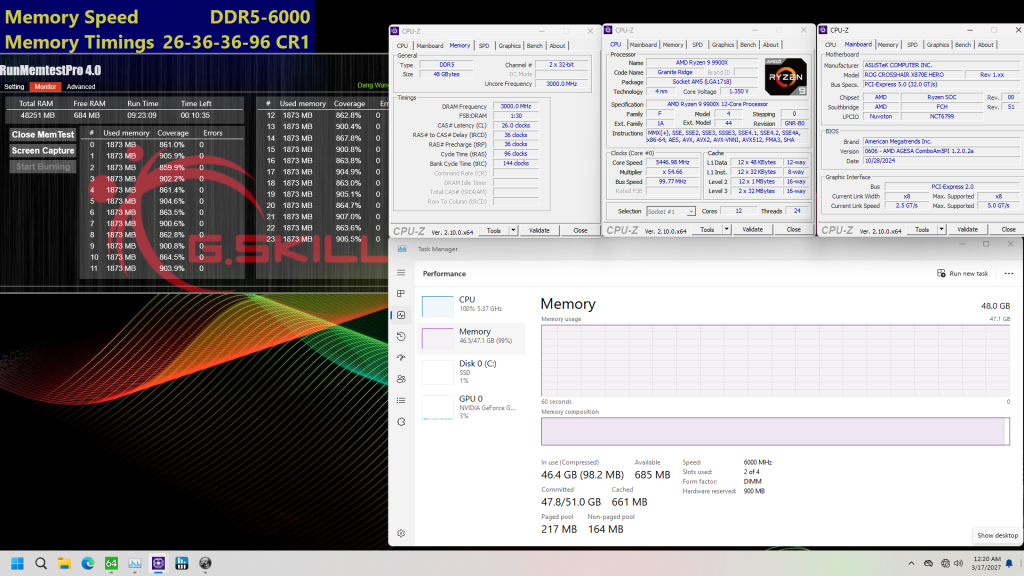 Following the previous announcement of the DDR5-6000 CL26-39-39-96 at 48GB (24GBx2) kit capacity, G.SKILL is updating this specification with an even lower tRCD and tRP latency of DDR5-6000 CL26-36-36-96 at 48GB (24GBx2) – making it an ideal choice for the latest compatible AMD AM5 platforms. Refer to the Memtest validation screenshot below on the ASUS ROG CROSSHAIR X870E HERO motherboard with the AMD Ryzen™ 9 9900X desktop processor.