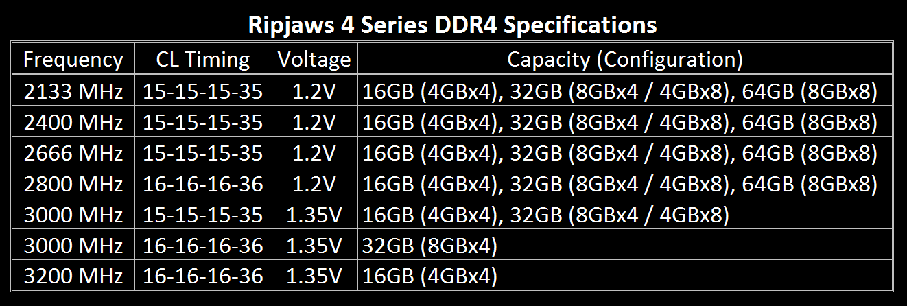 With a standard of 2133MHz, DDR4 is the next generation definition of performance. Also available in 2400MHz, 2666MHz, 2800MHz, 3000MHz, and 3200MHz, the starting lineup is continuing where DDR3 left off. With capacities starting at 16GB (4GBx4), 32GB (8GBx4 / 4GBx8) and 64GB (8GBx8), your new X99 platform will have more memory space to do what you need it to do. That’s not all! Ripjaws 4 also has an ultra low voltage rating of 1.2V for kits under 2800MHz and 1.35V for 3000/3200MHz!