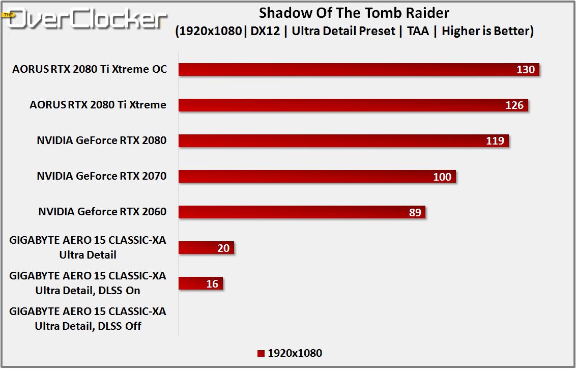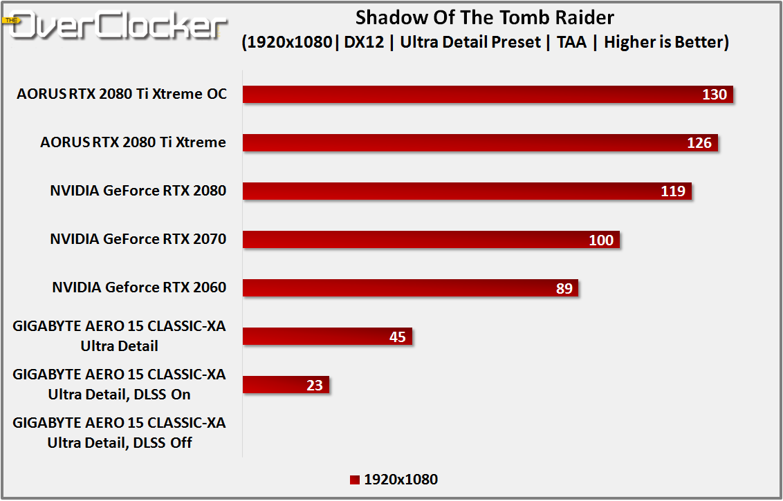 The jungles of Central America have never looked better than in Shadow of the Tomb Raider, which was recently patched to add ray tracing support. Ray tracing is only used for shadows, so in theory the performance hit isn’t as high as in games that use it for global illumination. Testing was done at 1920×1080 using the Highest preset and TAA, as well as Highest with DLSS and ray tracing set to Highest. The GeForce RTX in the GIGABYTE AERO 15 CLASSIC-XA has both the ray tracing and Tensor cores required for this.