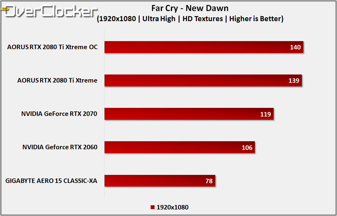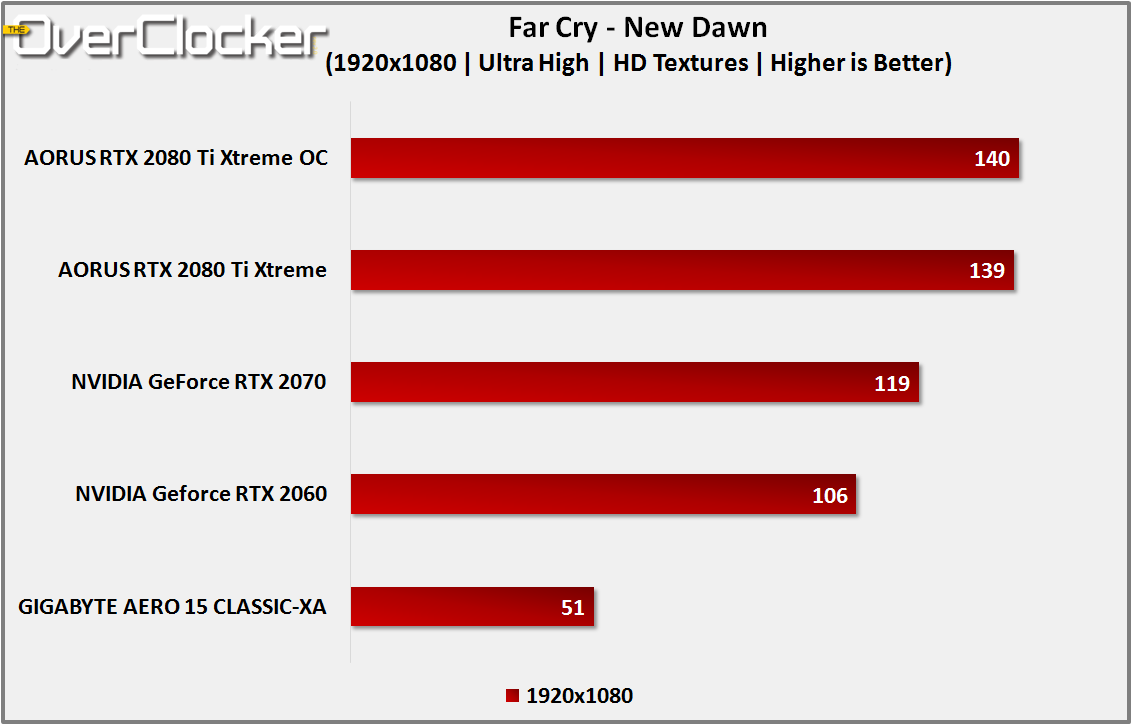 Following the events of Far Cry 5, New Dawn placed the player back in Hope County although in a post apocalyptic setting. Rather than the traditional grey and brown palette of such games, New Dawn offers vivid colours which look fantastic on the GIGABYTE AERO 15 CLASSIC-XA. The Ultra preset at 1920×1080 with HD textures enabled was used for testing.