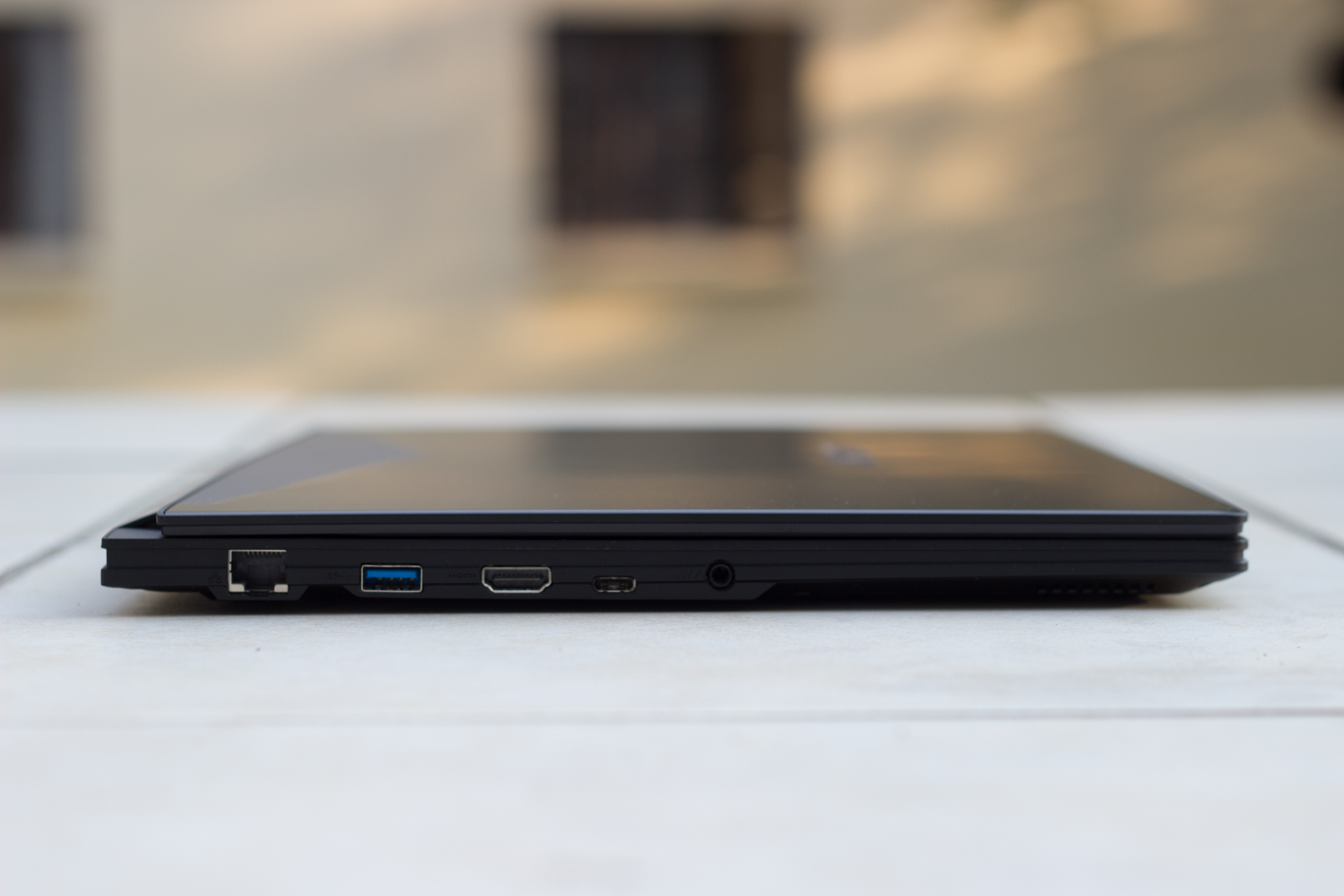 On the right of the laptop are two USB 3.1 Gen 1 ports, a Thunderbolt 3 port, and an SD card reader. Additionally, the power jack is on this side. Moving over to the left you will find a USB Type-C port which supports DisplayPort 1.4, an HDMI 2.0 port, a USB 3.1 Gen 2 port, an RJ45 port for Gigabit ethernet, and a single audio jack. The front and back of the laptop are void of connectors.