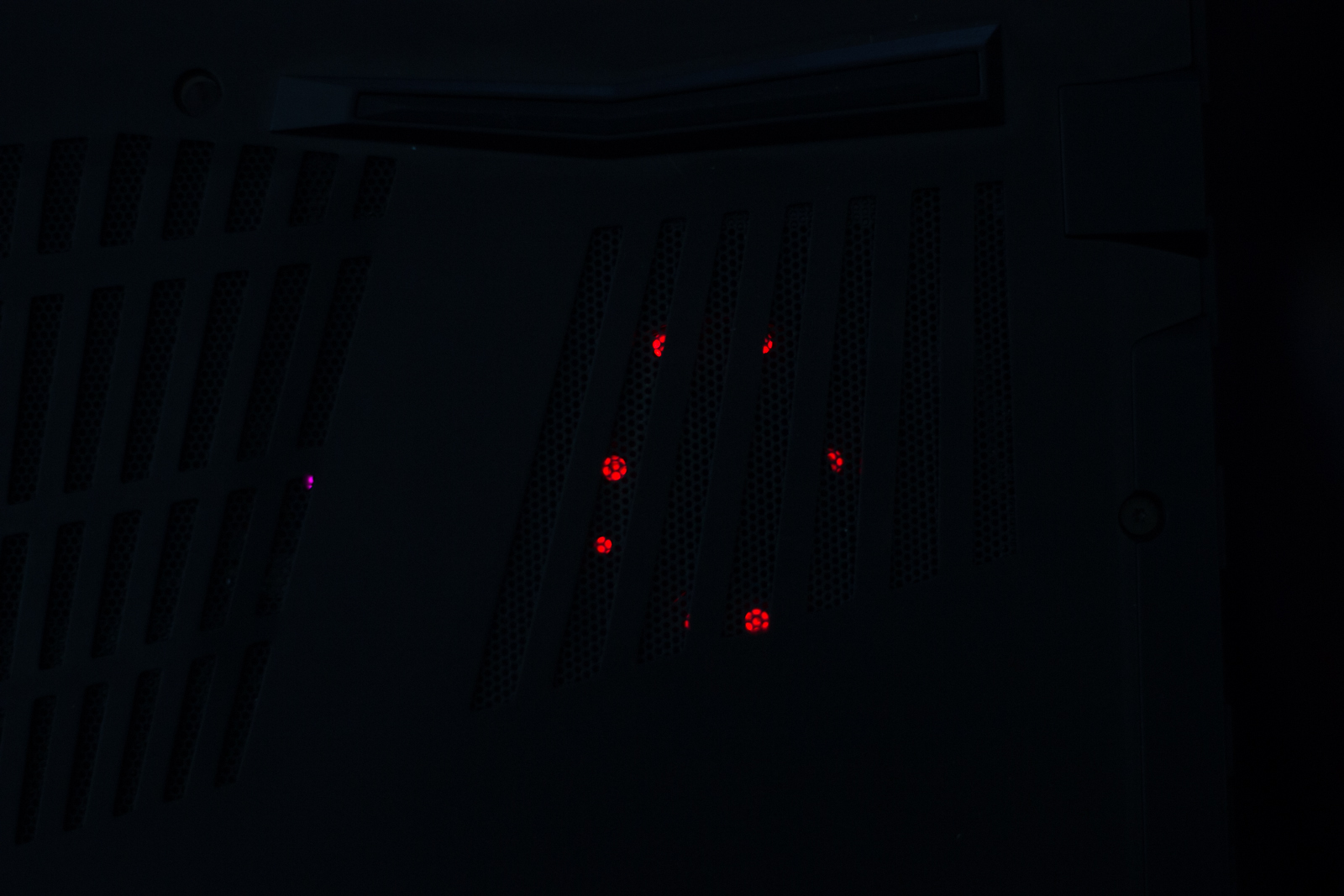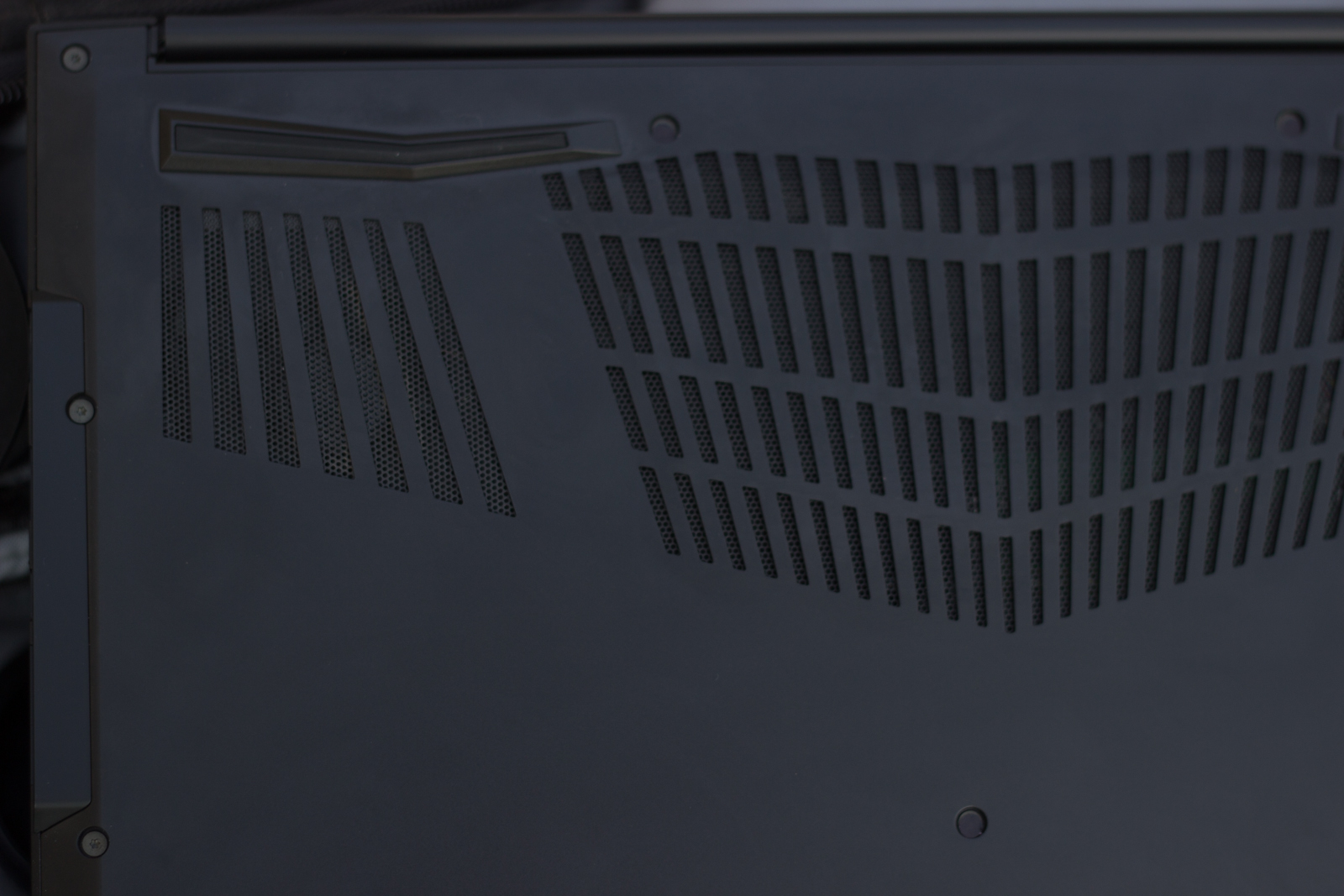 Flipping the laptop over, the ventilation holes take up about a third of the bottom of the laptop. This allows airflow to the high powered hardware inside. The Core i7-9750H, GeForce RTX 2070 and NVMe SSD are high performance components which run hot. With the keyboard’s lighting on, two fans are visible through the ventilation holes. There are no quick access panels for RAM or storage upgrades, but rather a single, solid panel. However, this is easy enough to remove with the thirteen easily accessible screws.