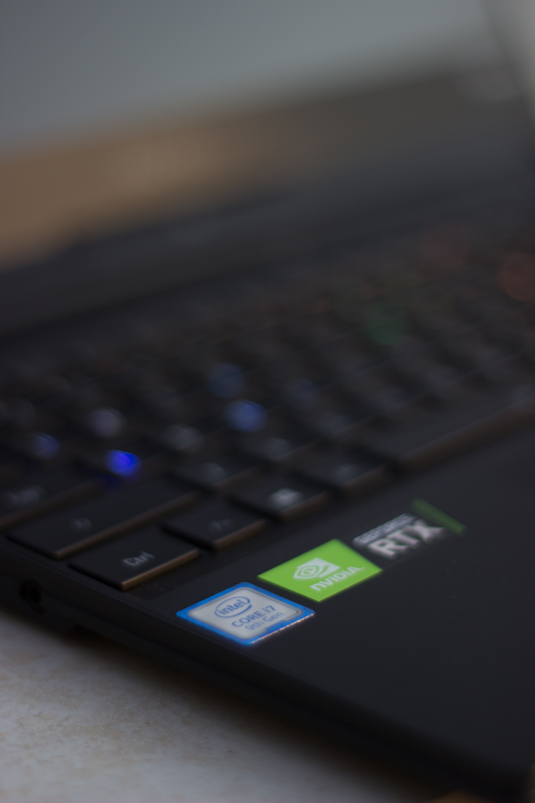 Below the keyboard is the touchpad, which is off-center and slightly towards the left of the laptop. This placed it directly between your hands when typing. On either side of the laptop are stickers which hint that this isn’t your standard business laptop. Core i7 9th Gen, GeForce RTX, Sharp 240 Hz – these are some of the signs that there’s something a bit special about this otherwise standard looking laptop. To the bottom right of the screen is another sticker, identifying the screen as being Pantone Certified.