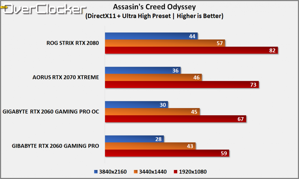 From the results you can see that Assassin’s Creed Odyssey has the RTX 2060 delivering a median of 28FPS, while overclocked that becomes a 30FPS at the 4K resolution. Hardly what one would consider playable. For this title the RTX 2060 is suited only for FHD and maybe 2560 x 1440. With that said this title performs better in actual game play than what the canned benchmark would suggest.