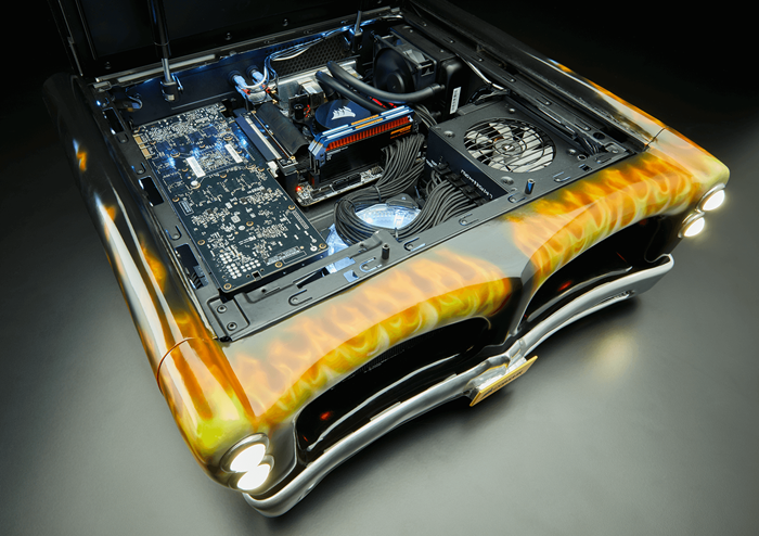 To celebrate the launch of DOMINATOR PLATINUM Special Edition Torque, CORSAIR commissioned renowned case modder Lee Harrington to create a chassis worthy of housing these limited edition DDR4 modules. Starting with a CORSAIR BULLDOG SFF kit, Lee created a stunning homage to 60’s hot-rods, complete with flaming paint job, pneumatic hood struts and working headlights.